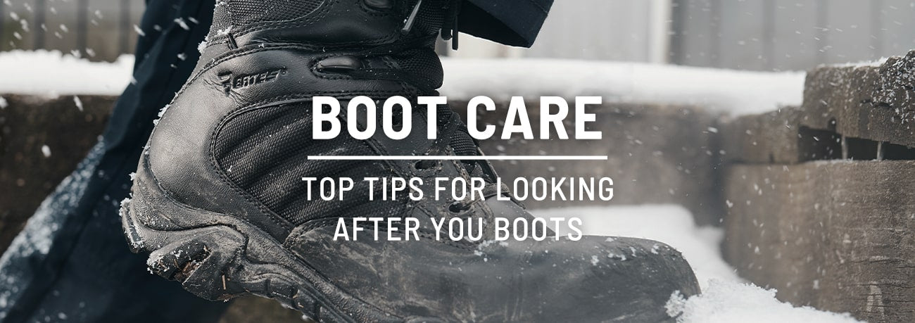 Use short, quick strokes with a stiff bristle brush to remove excess dirt from boots. If heavily soiled, wash with mild soap.