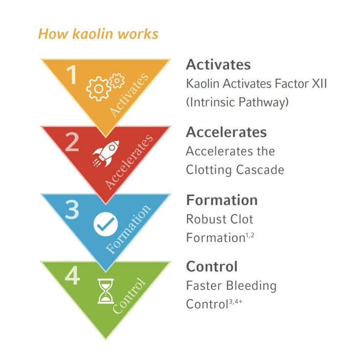 Kaolin is the unique differentiator for all QuikClot haemostatic products. QuikClot is a proprietary technology, which consists of a non-woven material impregnated with kaolin. Kaolin activates Factor XII on the intrinsic pathway, which in turn accelerates the clotting cascade leading to faster bleeding control.